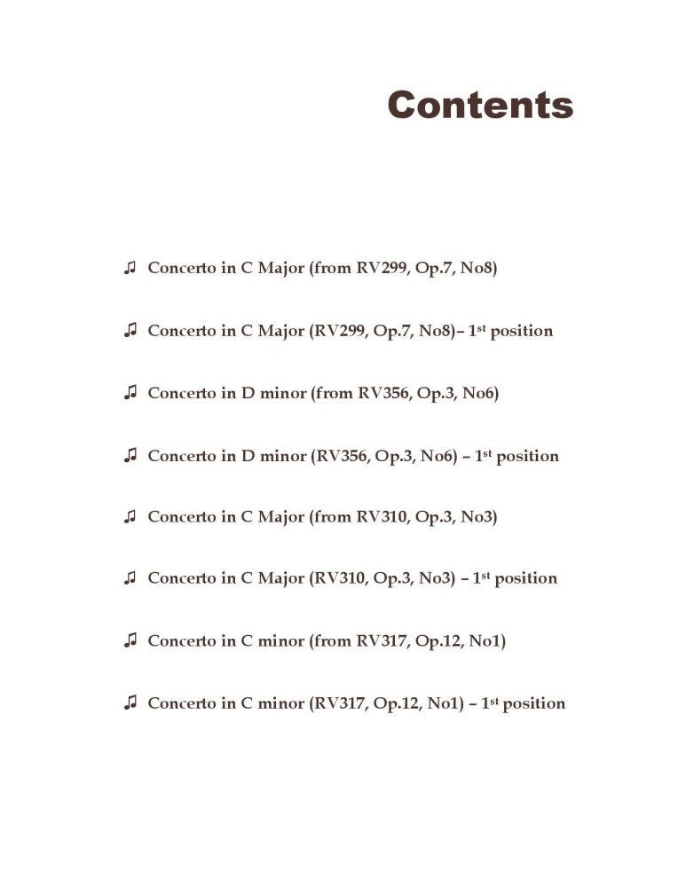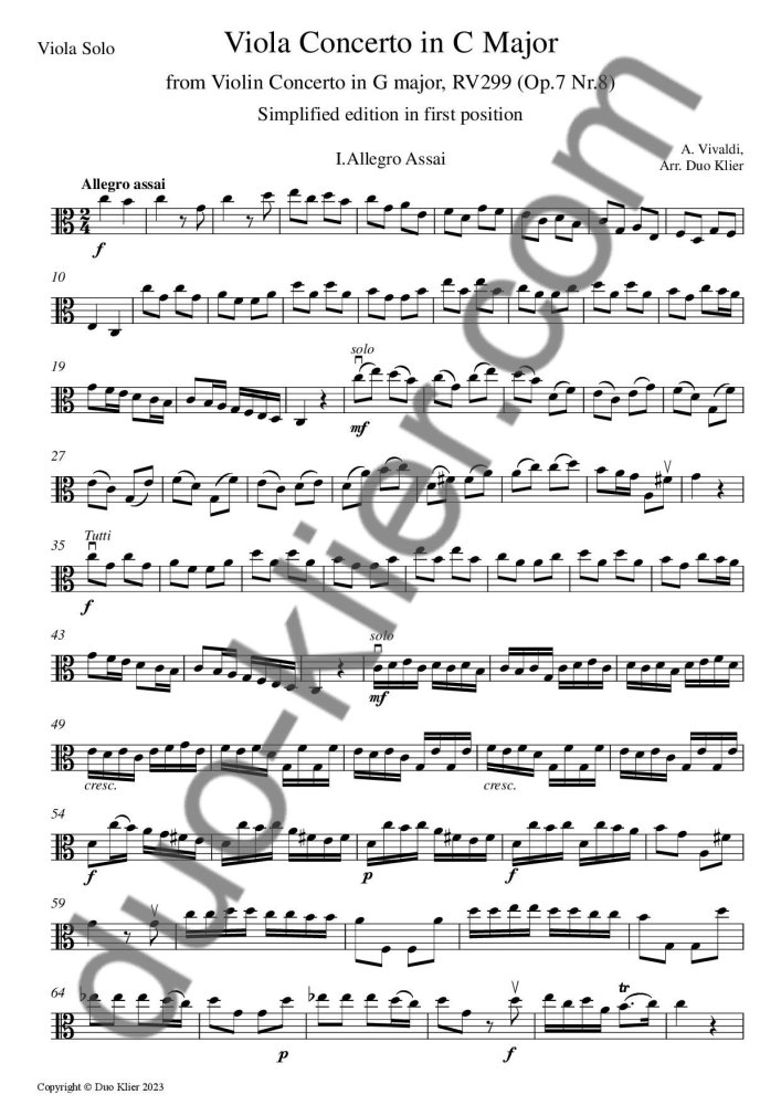 Arrangement: Viola Duets. The file includes Vivaldi's original versions and a simplified ones in first position, all in viola duet (viola solo + 2nd viola accompaniment). They all can be found separately in our store.