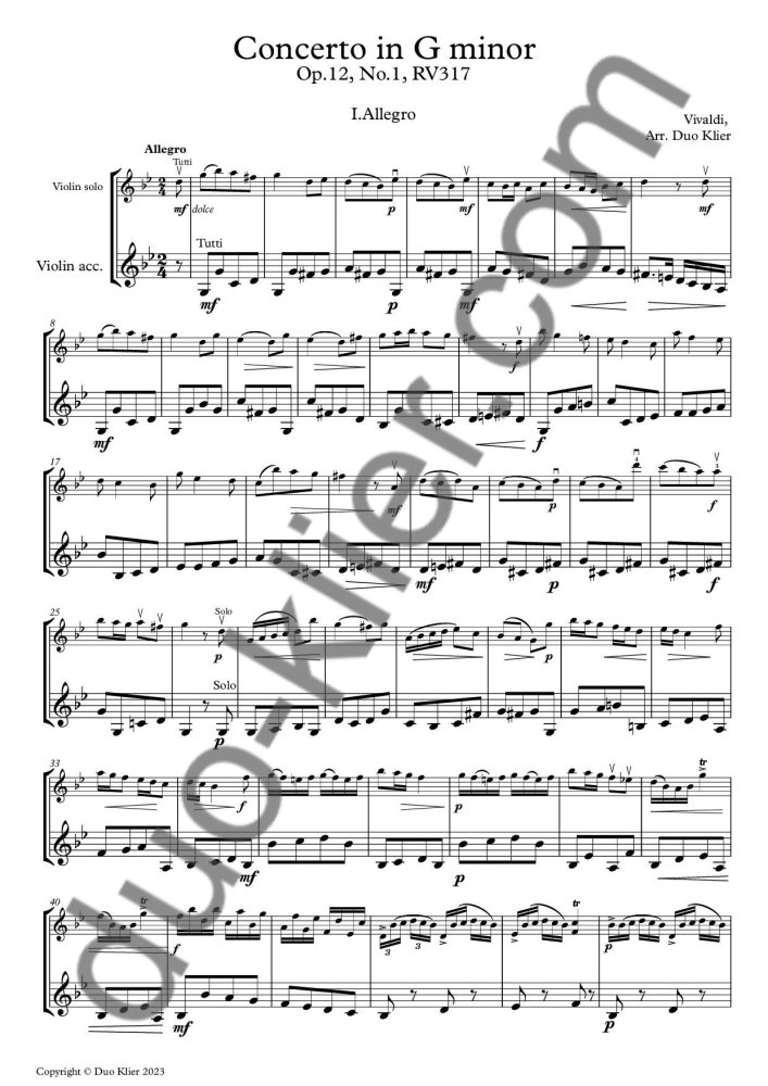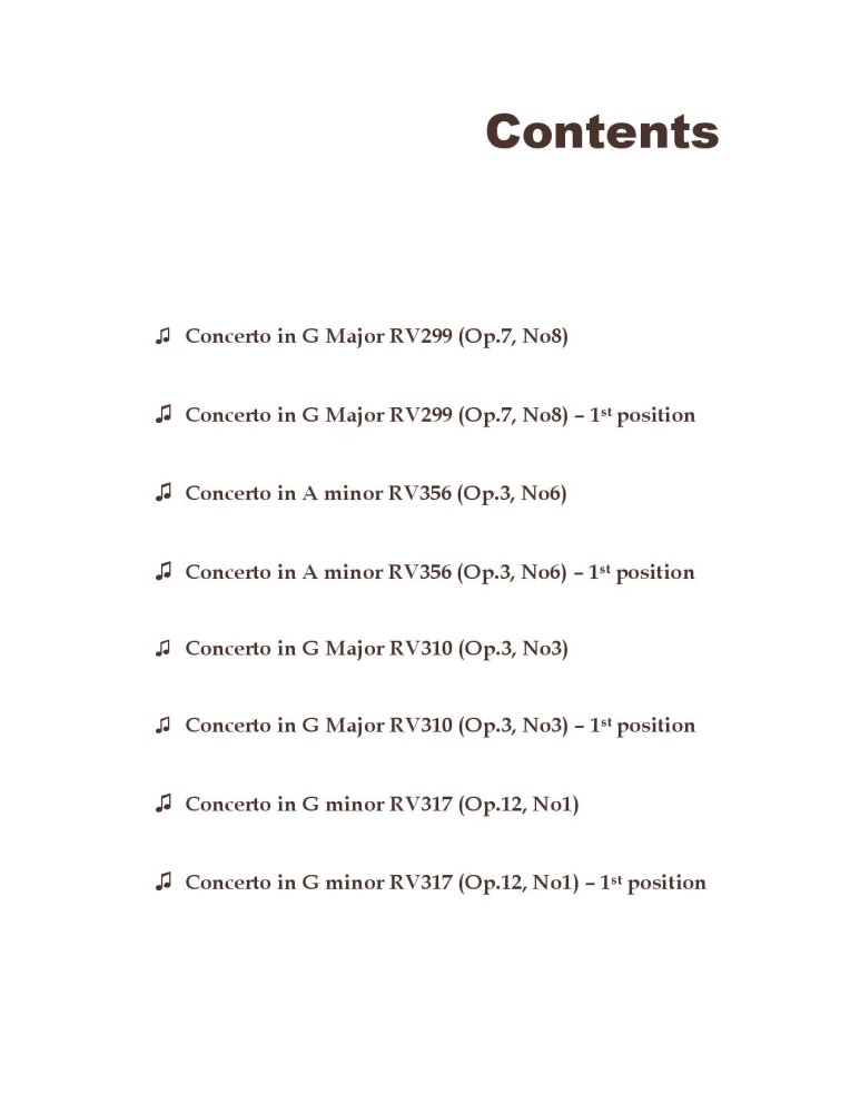 Arrangement: Violin Duets. The file includes Vivaldi's original versions and a simplified ones in first position, in violin duet format (violin solo + 2nd violin accompanimnet). They all can be found separately in our store.