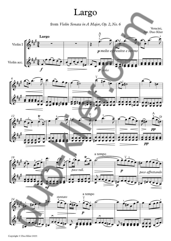 Number of pages: 2 + 2 (score + parts). Two accompaniments included, simple one based on Veracini's figured bass and a more romantic one with lots of double stops.