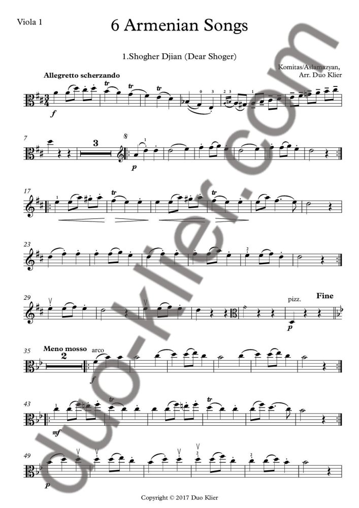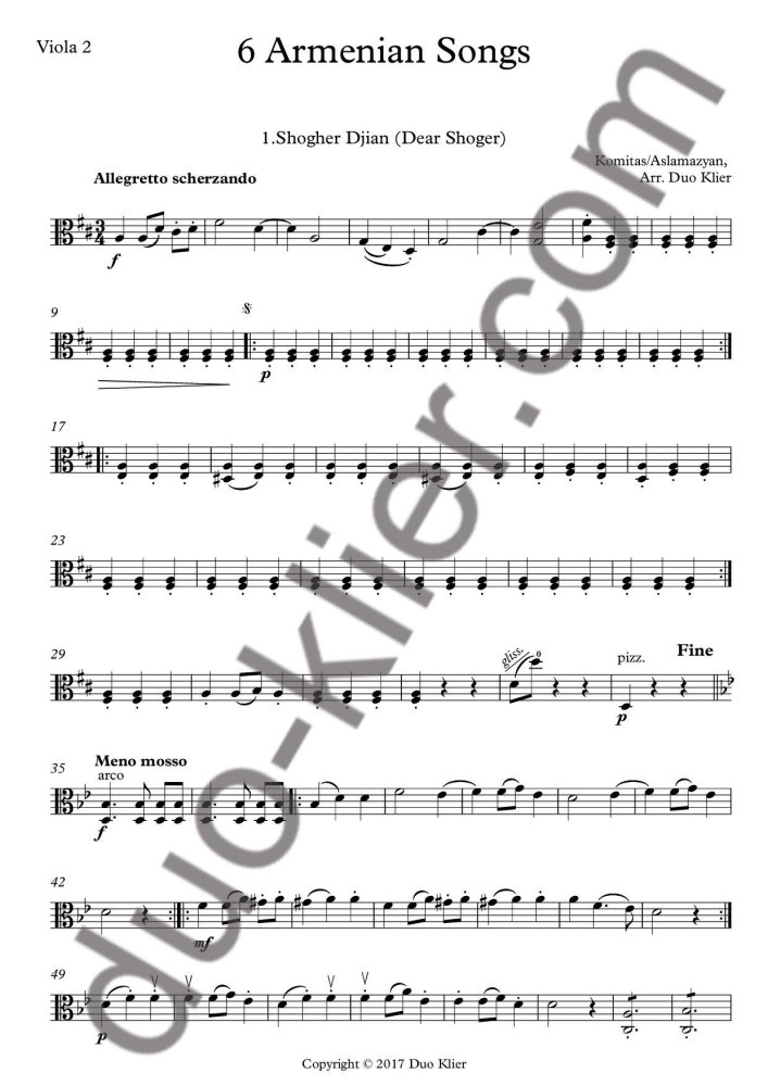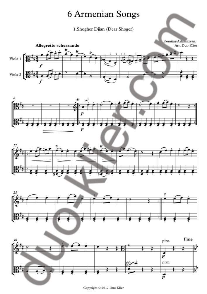 Work title: Six Armenian Songs for Two Violas. From the 14 pieces arranged for String Quartet by Sergei Aslamazyan